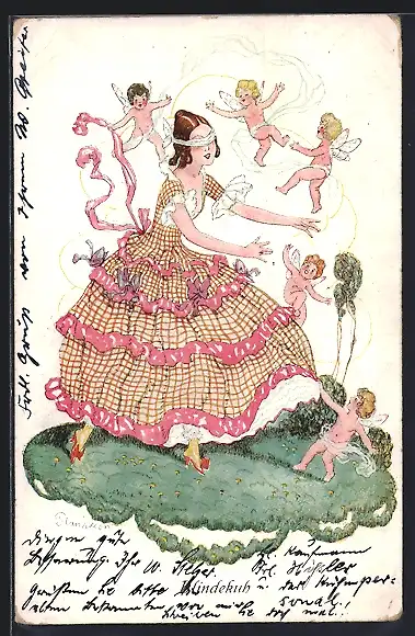 Künstler-AK Plantikow: Blindekuh, Mädchen sucht die Engelchen mit verbundenen Augen