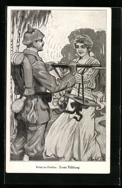 Künstler-AK Plantikow: Soldat in Uniform mit Pickelhaube begrüsst seine Liebste