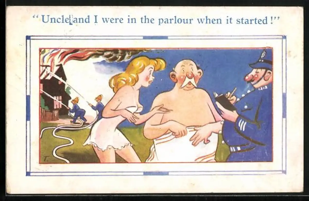 Künstler-AK Polizist nimmt den Bericht nach dem einem Feuer, Unlce and I were in the parlour when it started