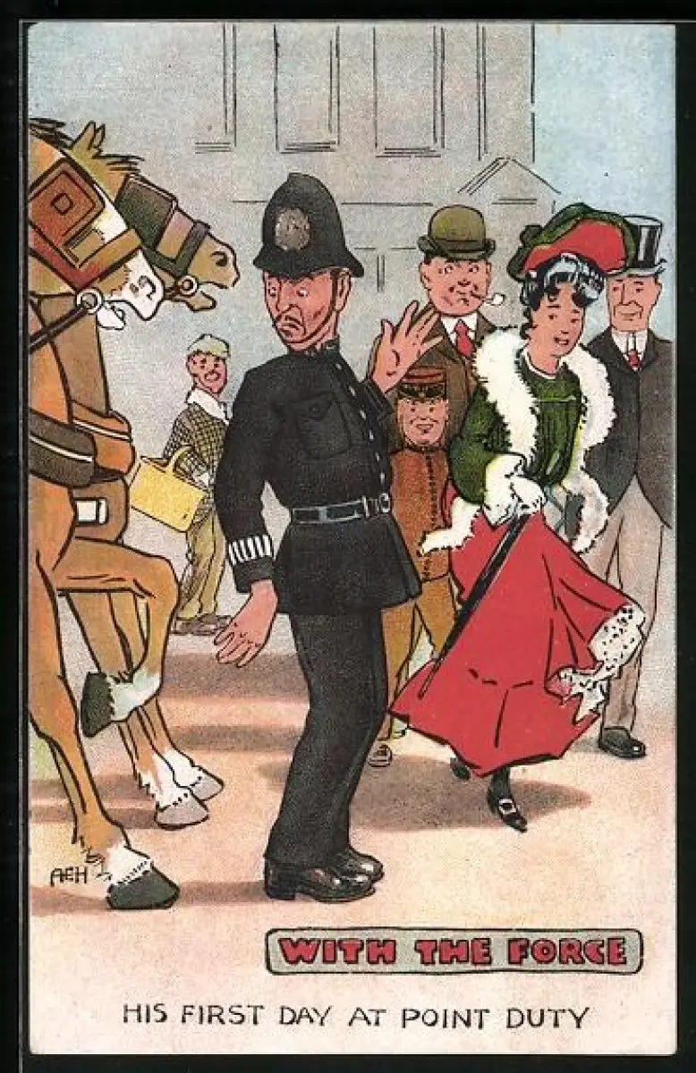 Künstler-AK Polizist schaut überrascht zu einem Pferd, His first day at point duty