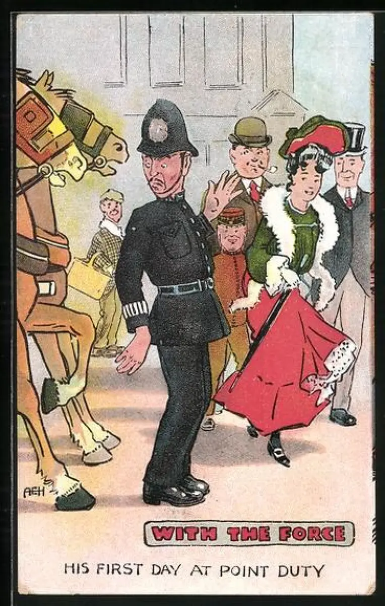 Künstler-AK Polizist schaut überrascht zu einem Pferd hinter ihm With the Force, His first day at point duty