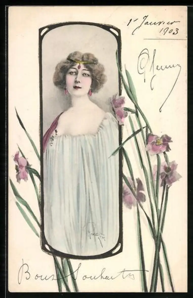Künstler-AK Porträt einer Dame mit Ohrringen und Kopfschmuck, Jugendstil