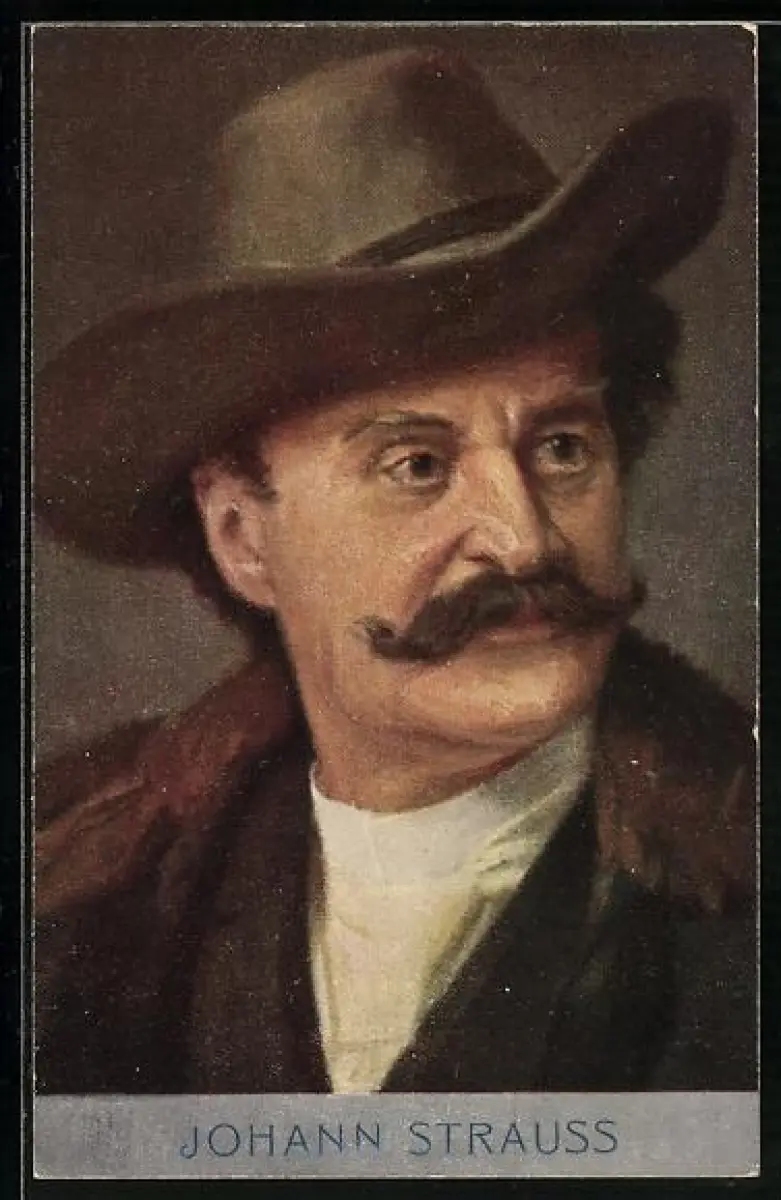 Künstler-AK Portrait Johann Strauss mit Schnauzbart u. Hut