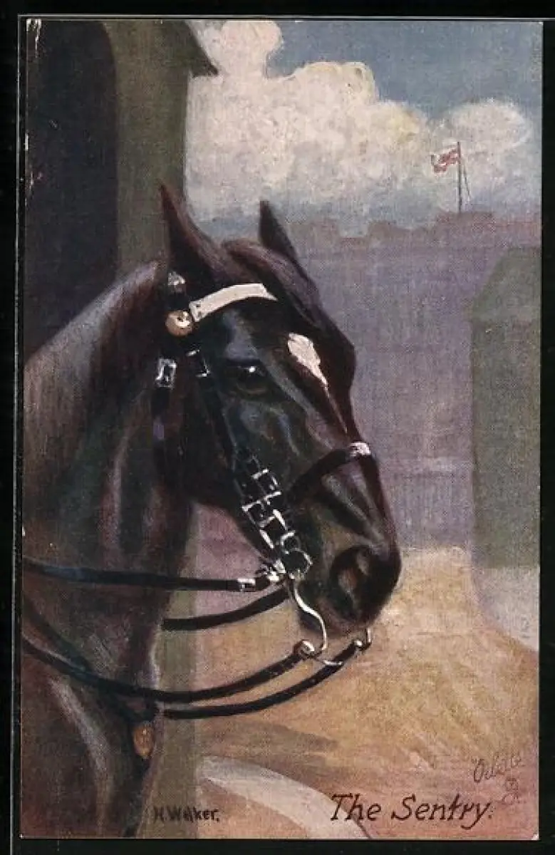 Künstler-AK Portrait eines Rappen an der Pferdebox
