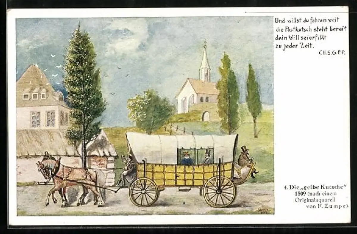 Künstler-AK Postkutsche fährt durch einen Ort