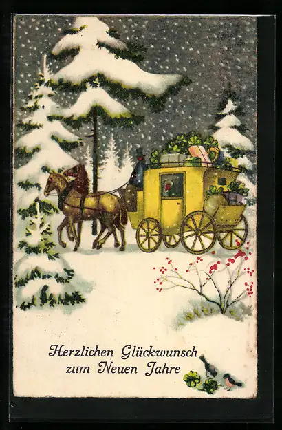 Künstler-AK Postkutsche fährt mit Kleeblättern durch verschneiten Wald, Neujahrsgruss