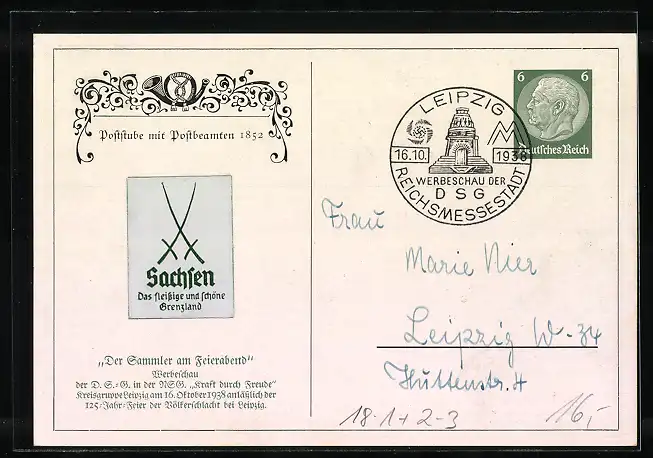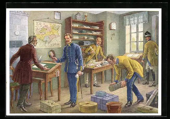 Künstler-AK Poststube mit Postbeamten 1852, Ganzsache 6 Pfennig