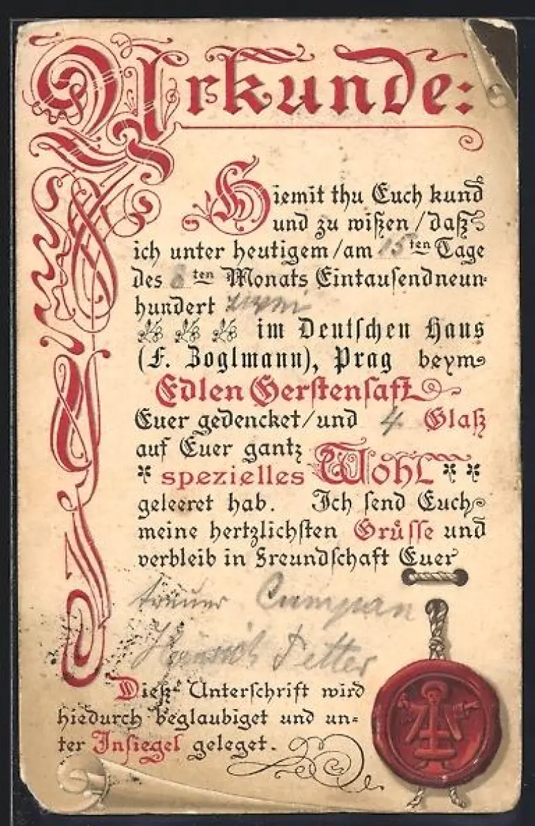 Künstler-AK Prag / Praha, Gaststätte Deutsches Haus F. Boglmann, Urkunde über Biergenuss