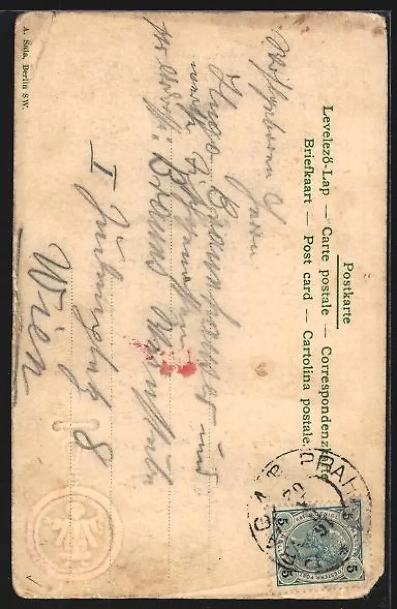 alte Ansichtskarte, gelaufen 1902, Ecken bestoßen, Papierrest u. Eckknick oben re., Eckschaden unten li., Stempelspur