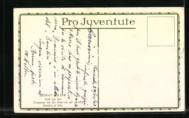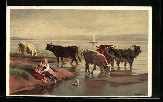 Künstler-AK Pro Juventute, Rinder am Seeufer, Segelboot