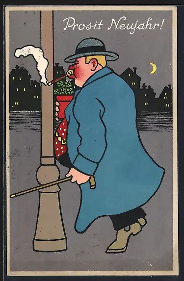 Künstler-AK Prosit Neujahr, Betrunkener lehnt an einer Strassenlaterne