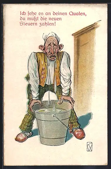 Künstler-AK Prosit Neujahr!, Ich sehe es an deinen Qualen, du mussst die neuen Steuern zahlen!