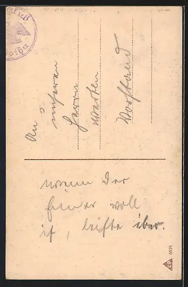 Personenbezogene Daten auf der Rückseite der Karte wurden durch blauen Textmarker unkenntlich gemacht. Die blauen Stellen sind auf die Vorderseite durchgeweicht und wirken sich negativ auf das Postkartenfoto aus