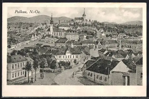 Künstler-AK Pulkau /N.-Oe., Teilansicht mit Kirche und Strassenpartie