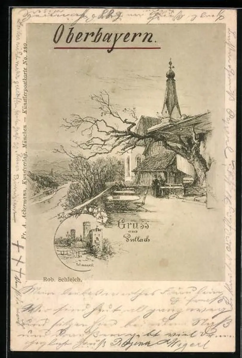 Künstler-AK Pullach, Schwaneck, Gasthaus mit Kirche und Flusspartie
