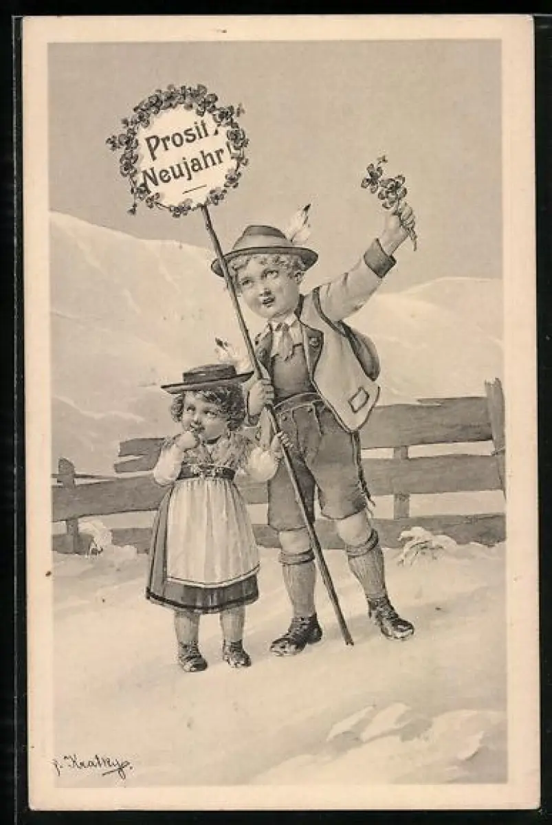 Künstler-AK R. Kratky: Kleine Älpler wünsche Prosit Neujahr