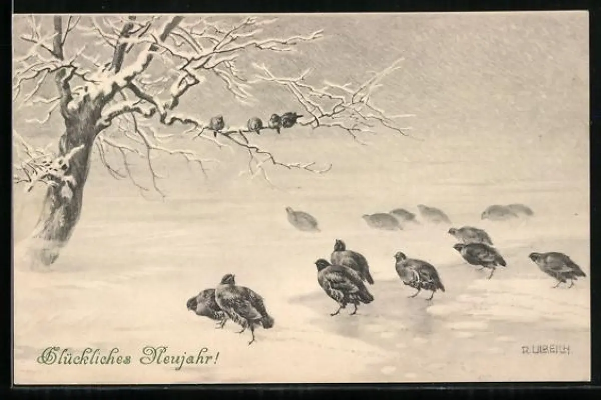 Künstler-AK R. Ulreich: Neujahrsgruss - Vögel auf verschneitem Eis