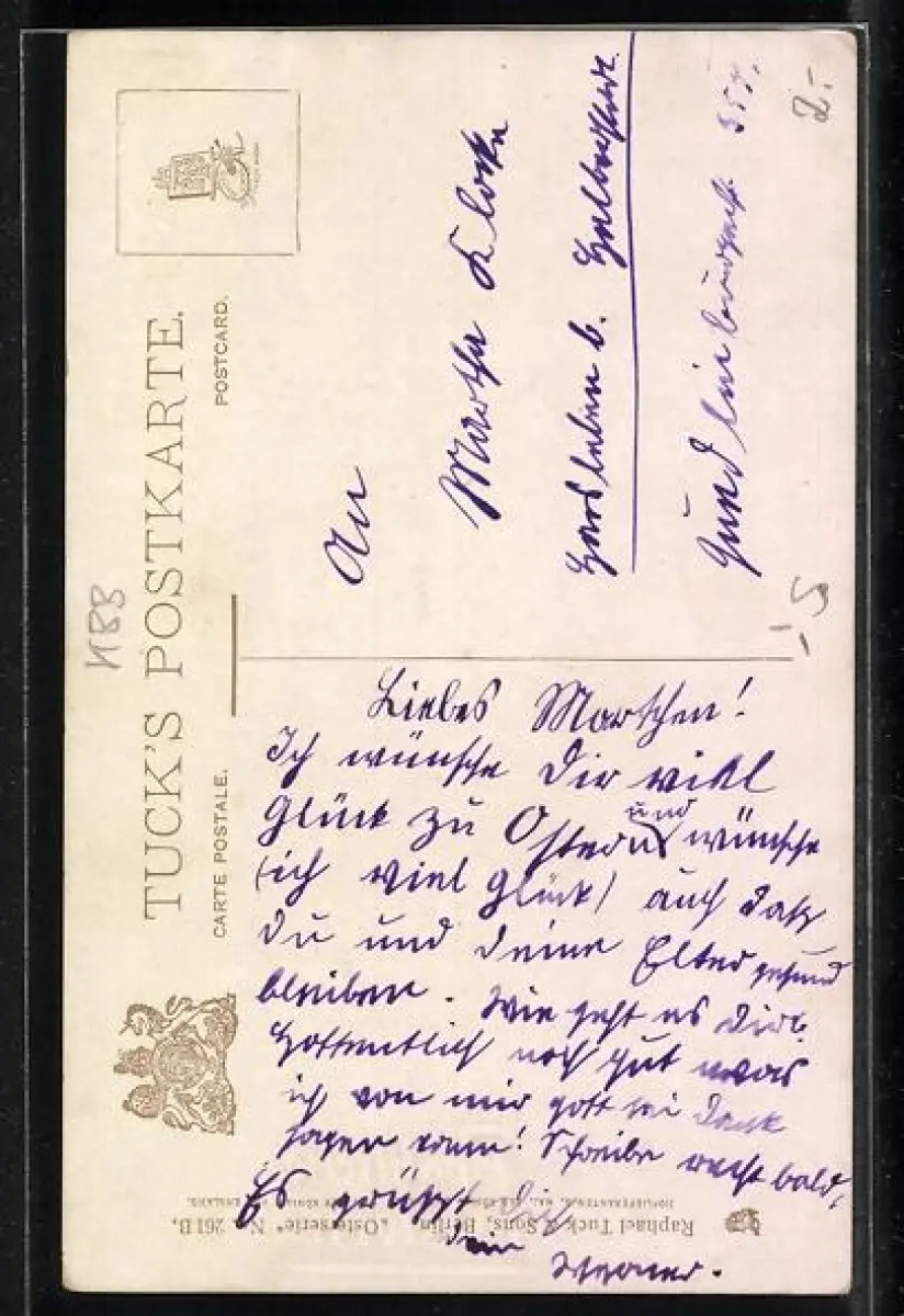 Personenbezogene Daten auf der Rückseite der Karte wurden durch blauen Textmarker unkenntlich gemacht. Die blauen Stellen sind auf die Vorderseite durchgeweicht und wirken sich negativ auf das Postkartenfoto aus