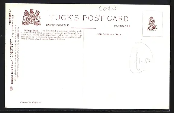 Künstler-AK Raphael Tuck & Sons Nr. 7462: Newquay, Bishop Rock