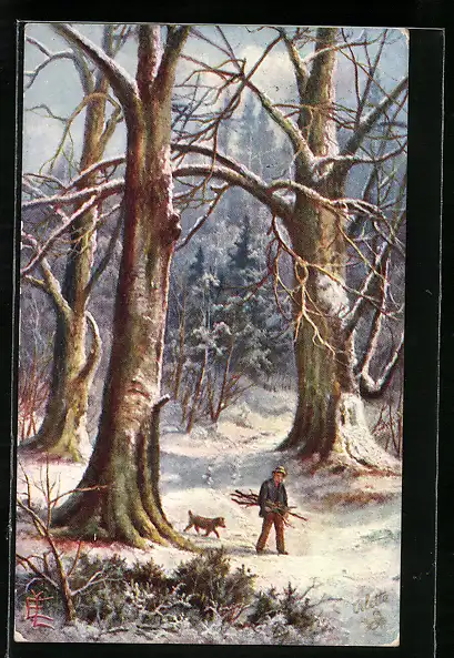 Künstler-AK Raphael Tuck & Sons Nr. 9617: Holzsammler mit Hund im verschneiten Wald