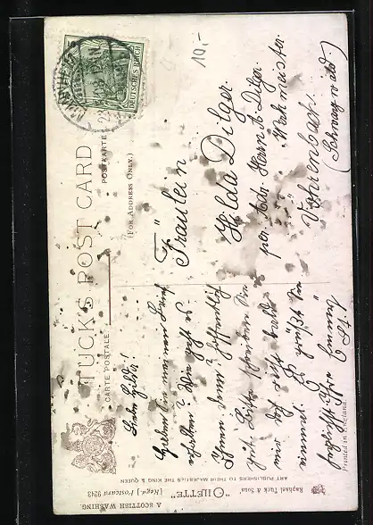 Personenbezogene Daten auf der Rückseite der Karte wurden durch blauen Textmarker unkenntlich gemacht. Die blauen Stellen sind auf die Vorderseite durchgeweicht und wirken sich negativ auf das Postkartenfoto aus
