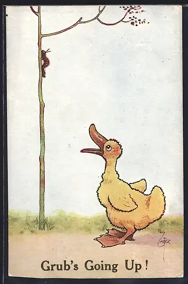 Künstler-AK Reg Carter: Ente schaut einer Raupe nach