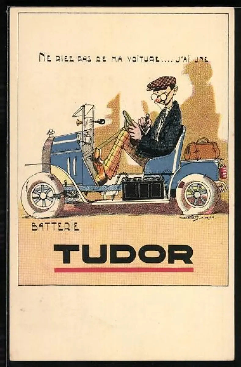 Künstler-AK Reklame Auto-Batterie Tudor, Mann in seinem Auto sitzend