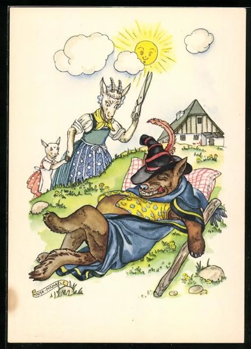 Künstler-AK Reklame für Indanthren, die Geissenmutter will dem Wolf mit der Schere den Bauch aufschneiden