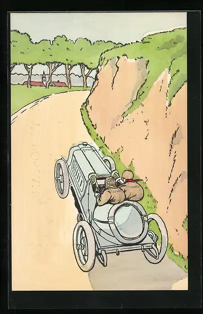 Künstler-AK Rennauto mit Ersatzreifen am Heck, Autorennen auf einer Landstrasse