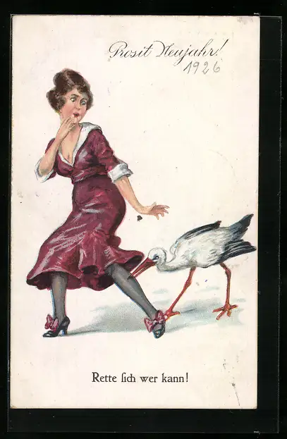 Künstler-AK Rette sich wer kann-Storch beisst junger Frau in die Wade, Erotik