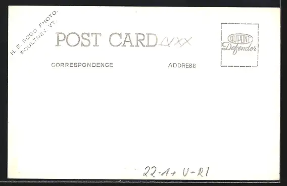 Personenbezogene Daten auf der Rückseite der Karte wurden durch blauen Textmarker unkenntlich gemacht. Die blauen Stellen sind auf die Vorderseite durchgeweicht und wirken sich negativ auf das Postkartenfoto aus