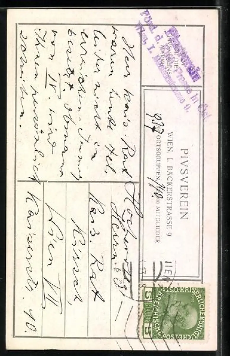 Personenbezogene Daten auf der Rückseite der Karte wurden durch blauen Textmarker unkenntlich gemacht. Die blauen Stellen sind auf die Vorderseite durchgeweicht und wirken sich negativ auf das Postkartenfoto aus