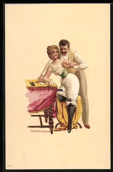 Künstler-AK Richard Hegedüs-Geiger: Dame in Unterkleidung schäkert mit einem Herrn