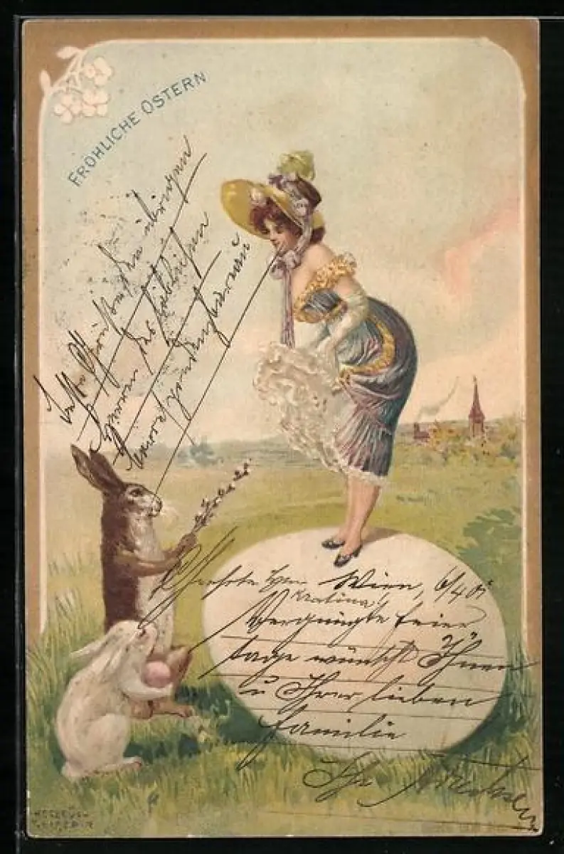 Künstler-AK Richard Hegedüs-Geiger: Dame steht auf einem riesigen Osterei