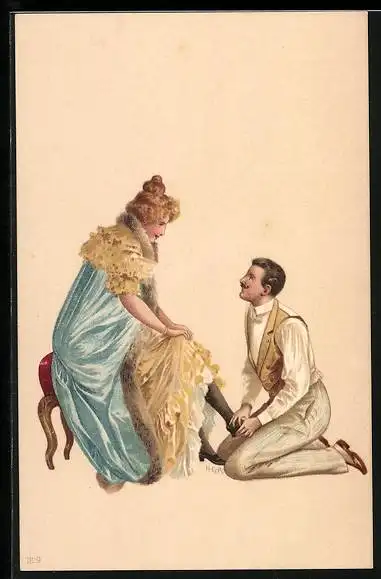 Künstler-AK Richard Hegedüs-Geiger: Kavalier ist junger Dame im Pelz beim Anziehen der Schuhe behilflich