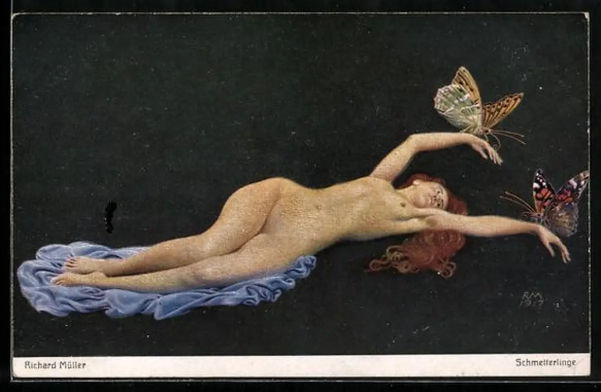 Künstler-AK Richard Müller: Liegender Frauenakt mit Schmetterling