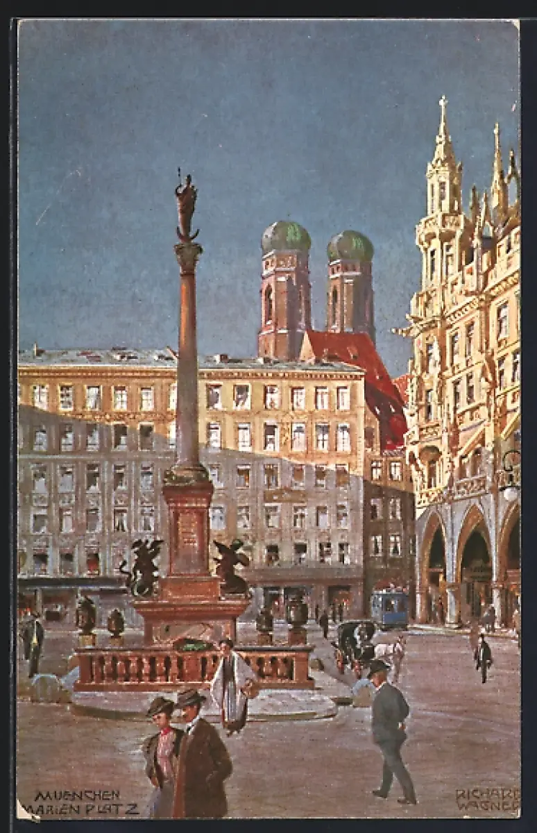 Künstler-AK Richard Wagner: München, Marienplatz mit Denkmal, Rathaus & Frauenkirche