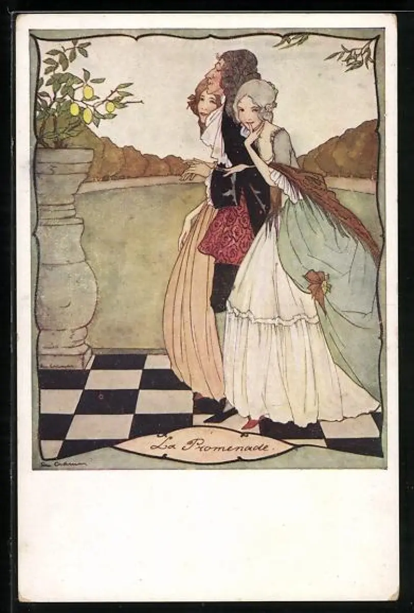 Künstler-AK Rie Cramer: Mann und zwei Frauen beim Spaziergang im Rokokokostüm