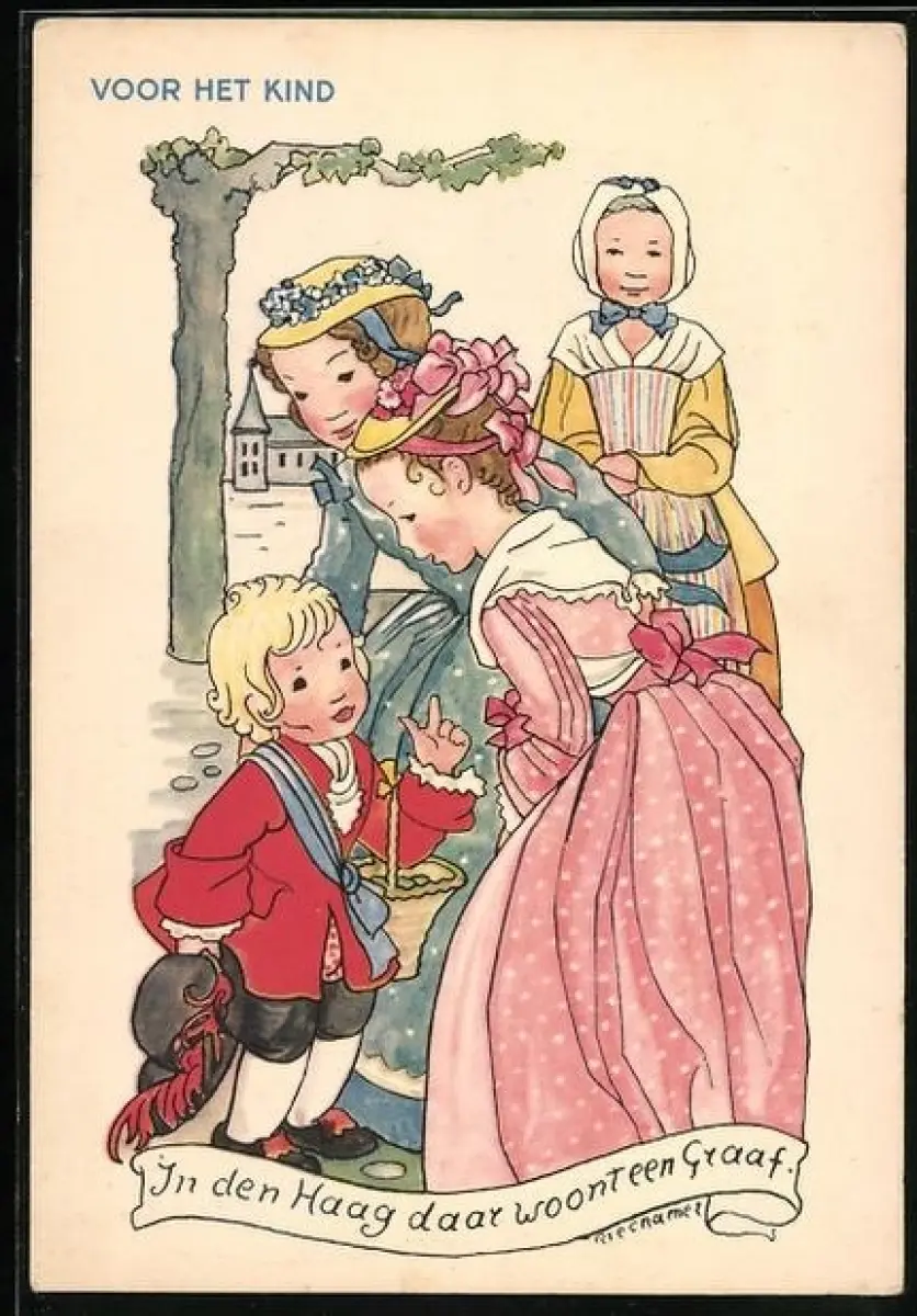 Künstler-AK Rie Cramer: Voor het Kind, Zwei junge Frauen stehen bei dem Knaben mit Blumenkorb und Federhut