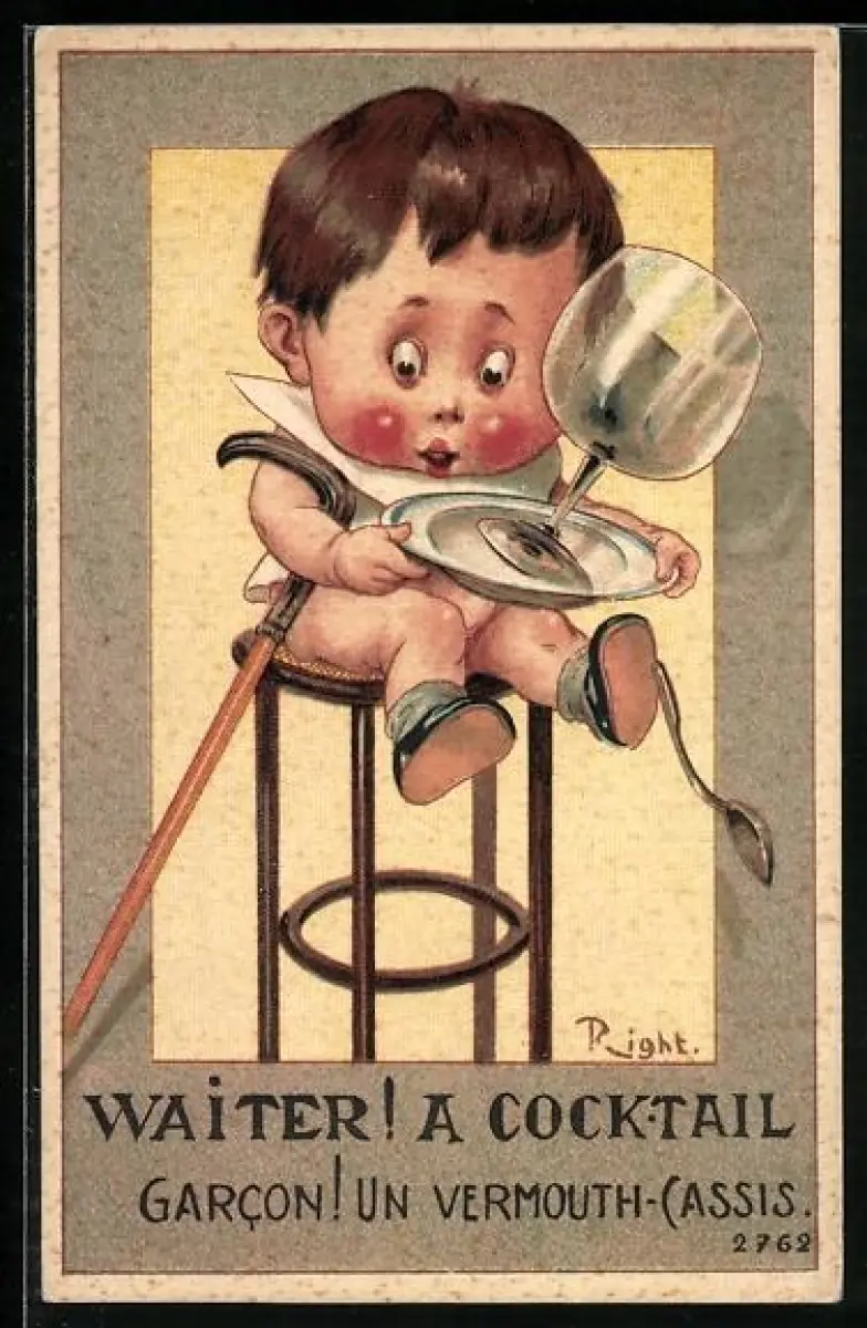 Künstler-AK Right: Waiter! a Cocktail, halbnackter Knabe mit leerem Weinglas auf einem Tablett