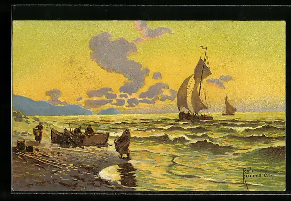 Künstler-AK Robert Kämmerer: Fischer bereiten ihr Segelboot zur Abfahrt vor
