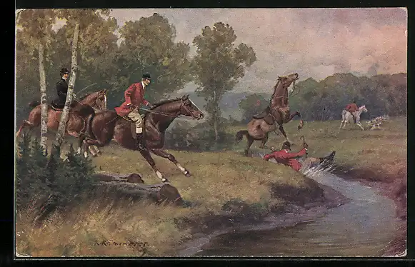 Künstler-AK Robert Kämmerer: Reiter auf der Jagd stürzt in einen Graben