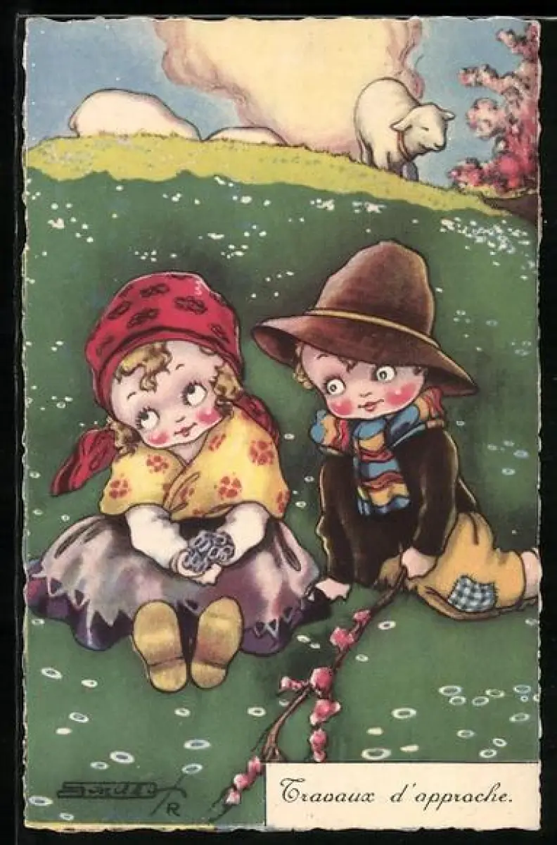 Künstler-AK Roberto Sgrilli: Kinder und Lamm auf einer Wiese