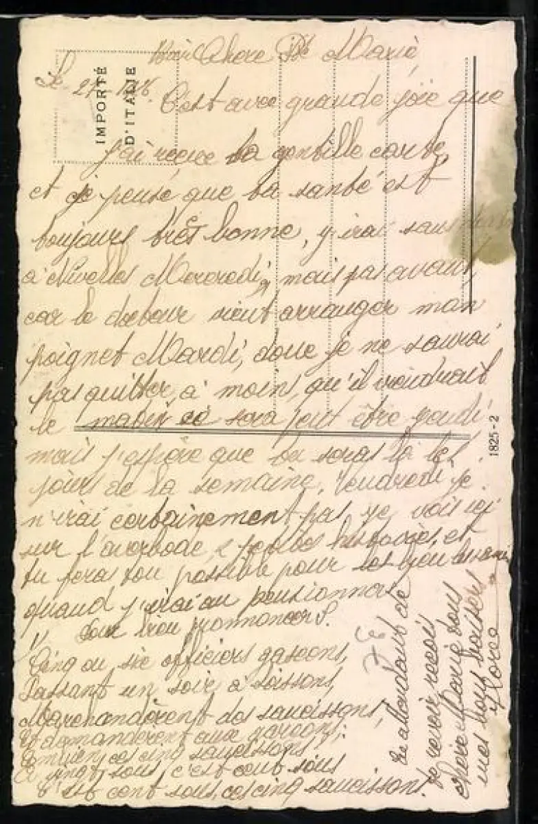 Personenbezogene Daten auf der Rückseite der Karte wurden durch blauen Textmarker unkenntlich gemacht. Die blauen Stellen sind auf die Vorderseite durchgeweicht und wirken sich negativ auf das Postkartenfoto aus