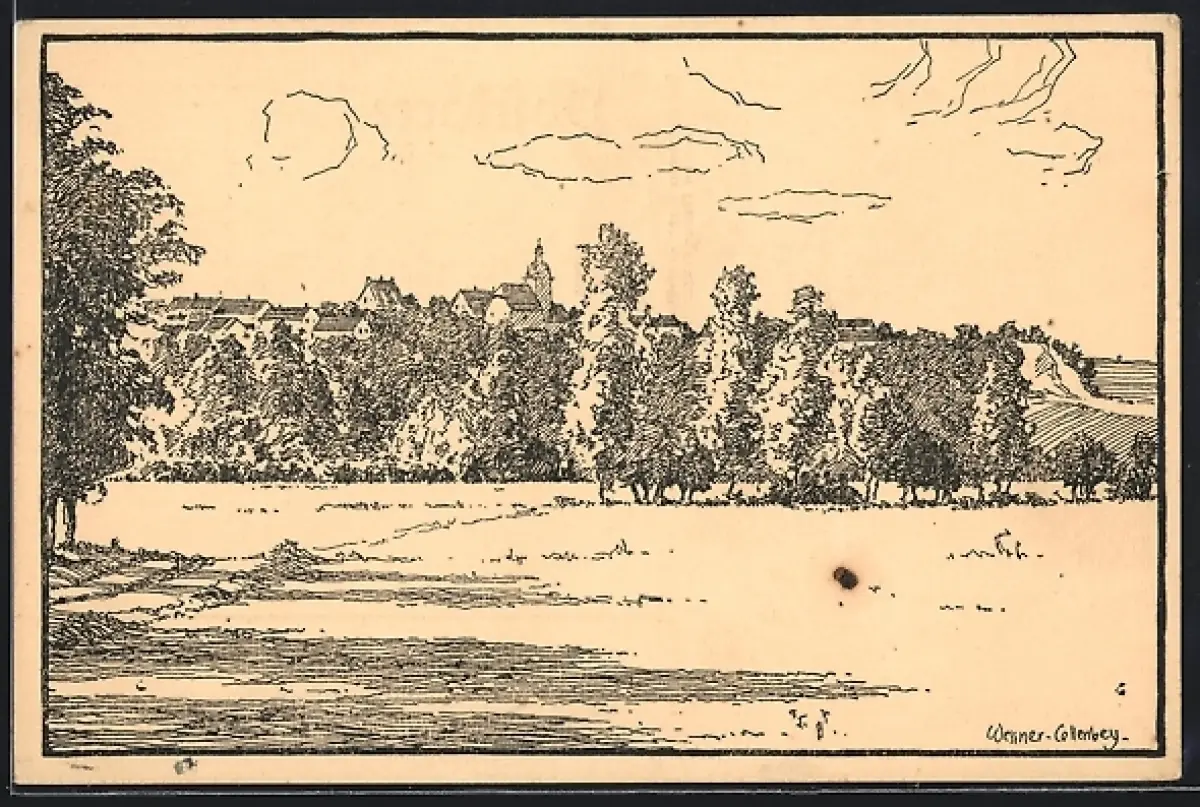 Künstler-AK Röglitz, Ortsansicht mit Bäumen und Gebäuden