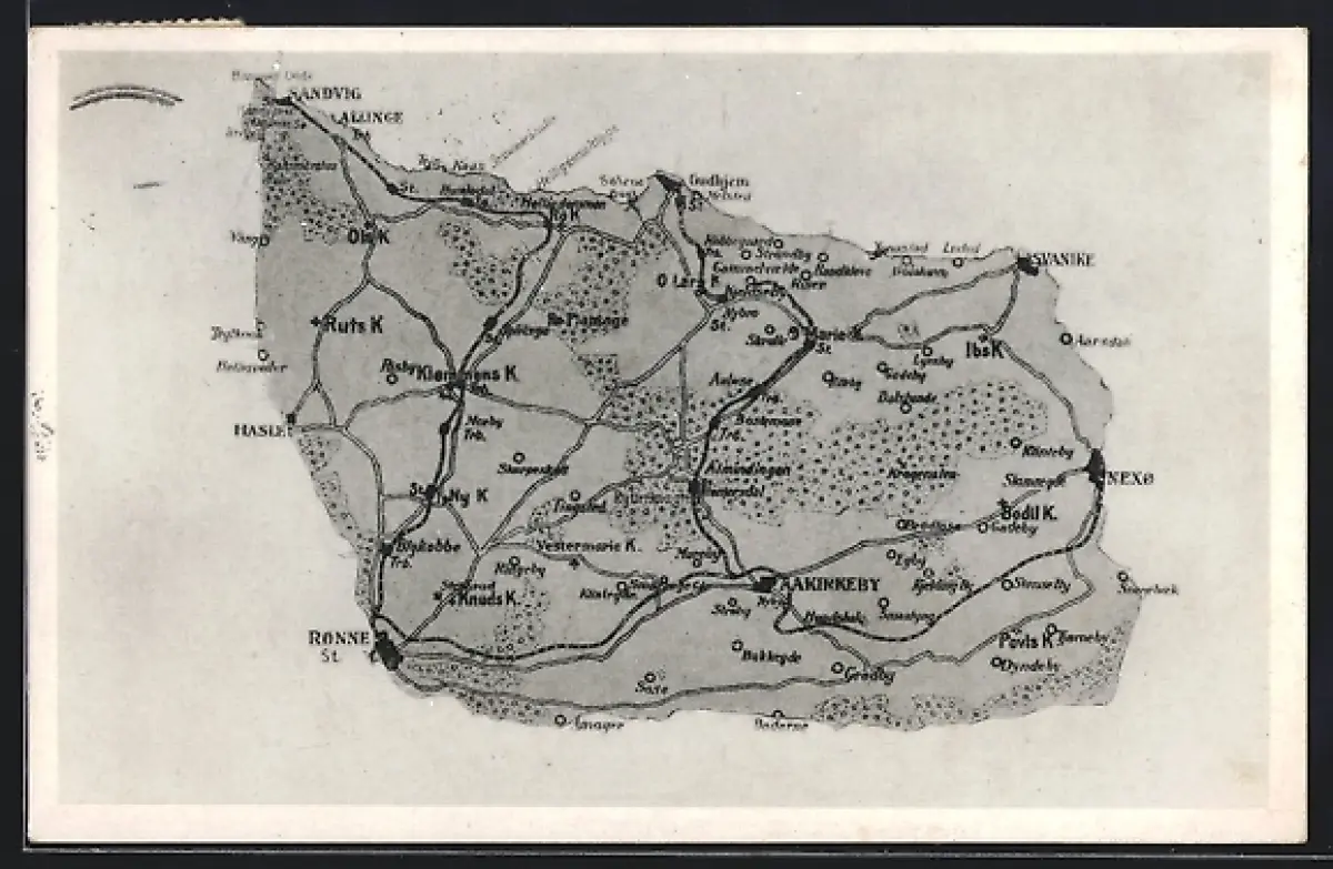 Künstler-AK Rönne, Landkarte mit Nexö, Aakirkeby, Gudhjem
