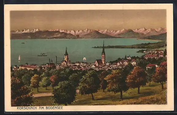 Künstler-AK Rorschach am Bodensee, Ortsansicht mit Alpenpanorama