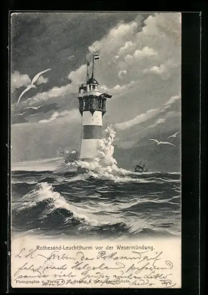 Künstler-AK Rothesandleuchtthurm vor der Wesermündung bei Sturm