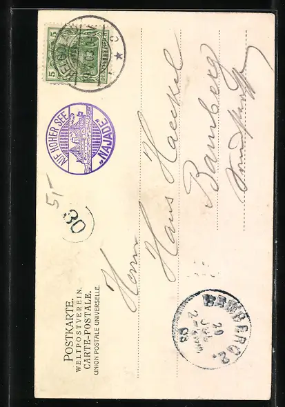 Personenbezogene Daten auf der Rückseite der Karte wurden durch blauen Textmarker unkenntlich gemacht. Die blauen Stellen sind auf die Vorderseite durchgeweicht und wirken sich negativ auf das Postkartenfoto aus