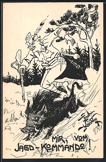 Künstler-AK Rud. Kristen: Jagd-Kommando, Wildschwein und Soldat